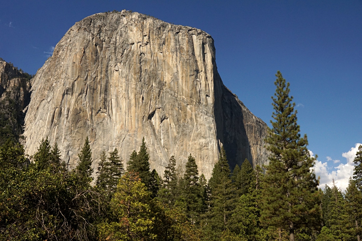 Der Yosemite Nationalpark, ein Naturwunder mit seinen hervorstehenden Granitfelsen, beeindruckenden Wasserfällen (allerdings nur im Frühling) und den Mammutbäumen wurde erstmals am 30. Juni 1864 von Abraham Lincoln unter Naturschutz gestellt. Die aktuelle Größe des Gebietes hat der Kongress unter Theodore Roosevelt im Jahre 1906 als Nationalpark deklariert. Die Felsformationen wirken wie Kuppelbauten, die in den Himmel ragen. Man kann 16 verschiedene Granitarten finden - für die nächste Arbeitsplatte in der Küche hätte sich Monika schon ein Muster ausgesucht. Die Charakteristika des Granitgesteins sind die vielen Lagen (wie eine Zwiebel), die erkennbar sind, verursacht durch Erdbewegungen, hängende Täler (Wasserfälle), verursacht durch Gletscher, Felsblöcke in den Wiesen des nördlichen Abschnittes (Tuolumne Meadow), Hochglanzreflexionen (vom Gletscher poliert) und zu guter letzt die weißen Linien, hervorgerufen durch flüssige Einlagerungen von Feltspat und Quarz, die sich mit der Zeit verhärtet haben. Das Zentrum bildet das Yosemite Valley, umgeben von den über 2000 m hohen Felsformationen (El Capitano, Drei Brüder, Cathedral Spires, Half Dome,...) und den wunderschönen Wasserfällen, wobei die Yosemite Falls die höchsten der USA und die dritthöchsten der Welt sind.